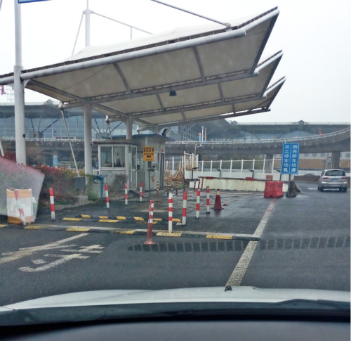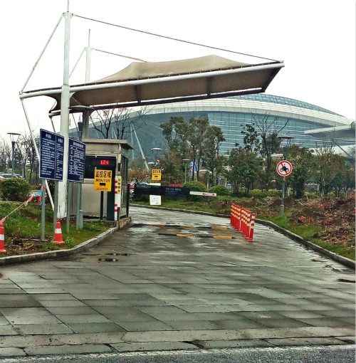 停車場出入口膜結(jié)構(gòu)雨棚,單邊懸挑造型簡單大方,也起到很好的標(biāo)識作用。