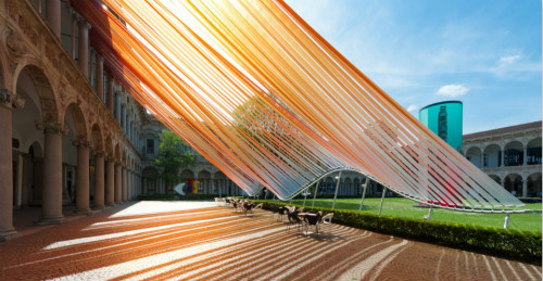 AD創(chuàng)作的公共空間ETFE膜材作品“無際”在2016米蘭設計周中展出。作品位于米蘭大學Cortile d’Onore的中央庭院,在“打開邊界”的展覽命題下,嘗試捕捉風和光線對環(huán)境造成的變化,創(chuàng)造出溫暖、靈動、自由的新空間,帶來開放、交流、對話的氛圍,提出新的思路。