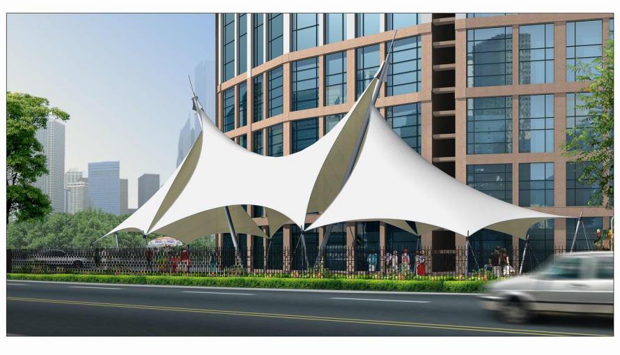 張拉結(jié)構(gòu)單元通常為平行排列。當(dāng)單元的張拉方向與空間的軸線方向產(chǎn)生旋轉(zhuǎn)時,單 元的跨度得以延長,膜布的曲線增加,同時避免了端部視角所形成的單元間彼此的遮擋,使膜結(jié)構(gòu)的造型特點充分展示出來。
