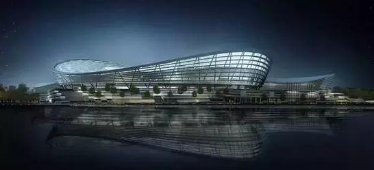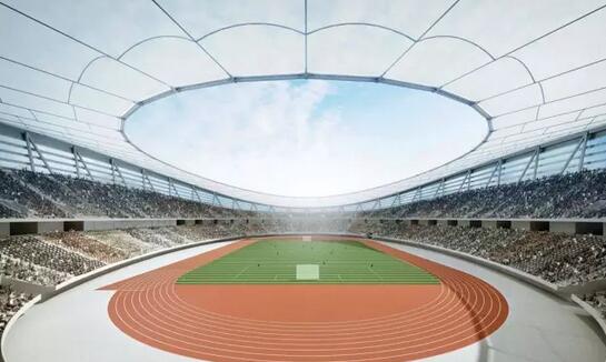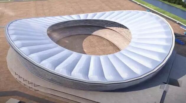 目前國內(nèi)采用單層索網(wǎng)結(jié)構(gòu)的場館跨度為100米左右,而園區(qū)體育中心體育場跨度達(dá)到了260米,為國內(nèi)最大跨度的單層索網(wǎng)結(jié)構(gòu)。該結(jié)構(gòu)為中間開孔的單層索網(wǎng)體系,設(shè)計思路來源于預(yù)張拉鋼條的自行車車輪,主要包括結(jié)構(gòu)柱、外壓環(huán)、徑向索以及內(nèi)環(huán)索,整個輪輻式索網(wǎng)屋蓋支撐在外圈傾斜的V型鋼柱上,形成了一個優(yōu)美的馬鞍型。體育場索網(wǎng)由40榀徑向索和內(nèi)側(cè)8根受拉環(huán)向索組成,全部索體均采用高標(biāo)準(zhǔn)的進(jìn)口密閉鎖,在索網(wǎng)體系上安裝鋼拱并覆蓋張拉PTFE膜材形成膜屋面,膜屋面投影總面積約為31900平方米,最大膜單元面積為1200平方米。
