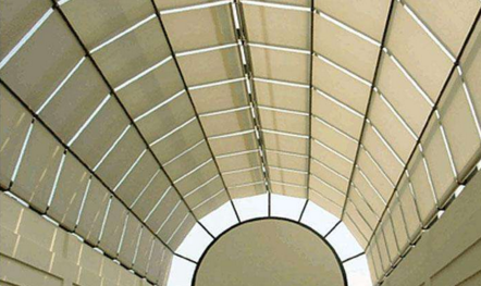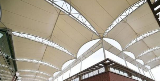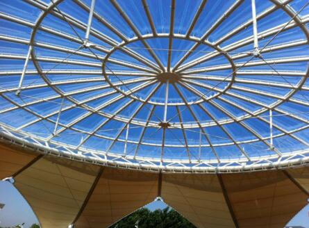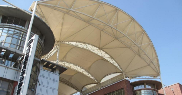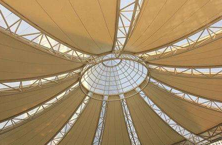 以建筑膜材作為屋面材料,具有高強(qiáng)度、耐腐蝕、自重輕、造型自由飄逸等優(yōu)異的特點(diǎn),現(xiàn)在已經(jīng)成為很多屋面材料的首選,像鳥巢、水立方、上海世博會(huì)的很多場(chǎng)館都用到。屋面天蓬是建筑體量的一部分,其形式對(duì)建筑物的造型有很大影響,所以在選材及設(shè)計(jì)上也十分重要,膜結(jié)構(gòu)輕巧別致極具現(xiàn)代化風(fēng)格,且表現(xiàn)形式多樣易于安裝移動(dòng),在商業(yè)街設(shè)施建筑中將越來越重要。