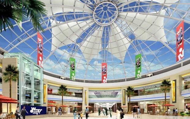 商業(yè)街的主要特點(diǎn)是因商業(yè)店鋪的集中而形成了室內(nèi)室外購(gòu)物、休閑、餐飲等功能空間,步行街及中央活動(dòng)區(qū)域是人們行走、休息、交流的開放空間,基于商業(yè)街特色,就決定了所有設(shè)計(jì)的核心就是讓空間更具人性化。中庭天蓬作為建筑附加設(shè)施,不僅要求遮陽(yáng)避雨的實(shí)用功能,也應(yīng)該是錦上添花的附件。膜結(jié)構(gòu)發(fā)展數(shù)年來,應(yīng)用于商業(yè)設(shè)施方面的工程案例在國(guó)內(nèi)已屢見不鮮,膜結(jié)構(gòu)建造的天棚簡(jiǎn)潔而大氣、柔美而剛勁、讓人們?cè)谛蓍e娛樂之時(shí)更加愜意。