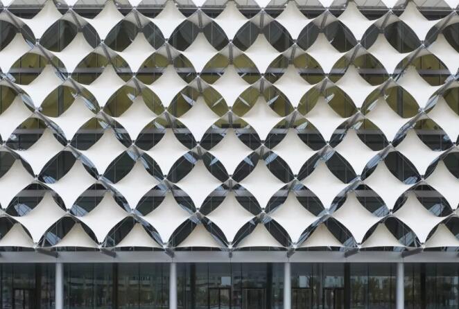 立面的外表皮是由長菱形的織物材料組成,這些白色薄膜通過立體的帶拉伸力的鋼絲繩結(jié)構(gòu)支撐起來,即張拉膜結(jié)構(gòu),不但具有遮陽的功能,而且用一種新的現(xiàn)代科技的方式重新詮釋了阿拉伯帳篷結(jié)構(gòu)的傳統(tǒng)。這個(gè)古代文化與現(xiàn)代技術(shù)交相融合后產(chǎn)生的獨(dú)特造型,形成了一個(gè)渾然一體的且有威望感的建筑外觀。夜晚,建筑物的立面會(huì)閃爍出不斷變化著的不同顏色的光,成為這個(gè)城市的一座文化燈塔。