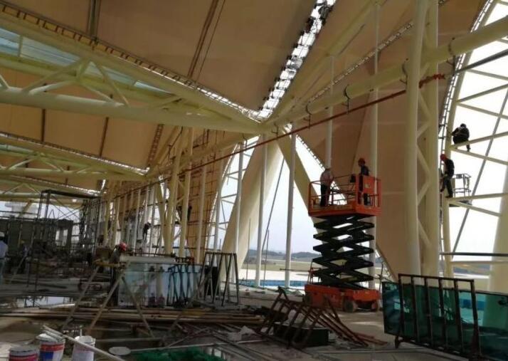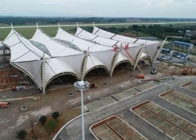 機(jī)場(chǎng)航站樓總面積近9000平米,整體采用國(guó)內(nèi)首創(chuàng)的鋼索膜結(jié)構(gòu)體系,用材和工藝都有嚴(yán)格要求,據(jù)悉,由于跨度大,重量達(dá)到45噸,然后膜結(jié)構(gòu)采用200噸的預(yù)拉張壓硬力,這種工藝精度要求高,施工難度大。鋼結(jié)構(gòu)拉索膜模擬船帆,鋼架、拉索形同桅桿,營(yíng)造出“遠(yuǎn)浦歸帆”場(chǎng)景,展示出濃郁的岳陽(yáng)地域文化特色。