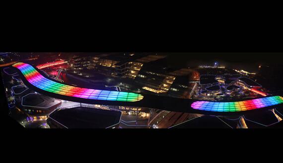 通過天幕屏,將人帶進(jìn)奇思妙想的光影世界。吊裝在天花頂上的大型LED天幕屏宛如一條色彩艷麗的綢緞、明亮深邃的天空,再配合以新型LED燈條、燈帶、投影等照明設(shè)備,起到亮化、渲染作用。