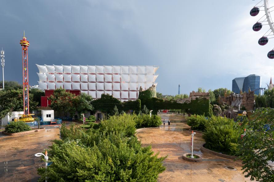 在一期項(xiàng)目和二期項(xiàng)目中,建筑都采用了項(xiàng)目的主題色--紅色,先建造一個(gè)滿足建筑基本功能的體量,再通過在體量上疊加一個(gè)由膜材料構(gòu)成的靈活形式,創(chuàng)造出一個(gè)動(dòng)態(tài)形象,這樣處理,不但縮短了施工周期,還大大降低了項(xiàng)目成本。