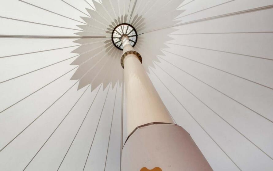這是一個(gè)超450平米的兒童游樂場,于上方覆蓋一把膜結(jié)構(gòu)“大傘",采用白色PVC膜材,大傘中央以一根鋼管支撐,營造了一個(gè)明亮開闊無遮擋的空間。
