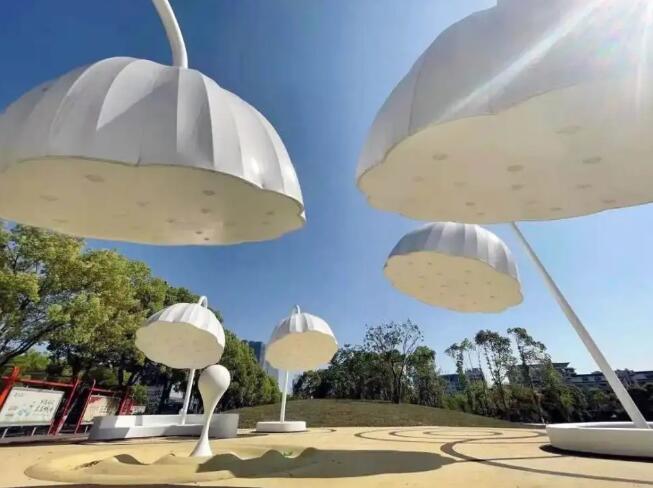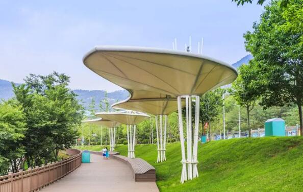 在已建成的口袋公園中,張拉膜結構設施的身影屢屢出現(xiàn),正是因為張拉膜的特性使之受到眾多設計者們的垂青,它體量可大可小,設計感強,可作為遮陽遮雨,非機動車棚,入口標識等設施存在,也能作為景觀小品存在。張拉膜還可選用彩色膜材來打造,與口袋公園活潑明快的設計理念一致,若配上燈光裝置,夜晚更是溫馨。
