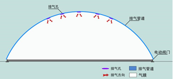 氣膜斷面一般為弧形,在頂部弧形區(qū)域存在較大平緩段,一般來(lái)講,矢跨比越小,平緩段越大,排水坡度也不足,存在極大的安全隱患,需要通過(guò)構(gòu)造措施來(lái)解決。由于超大跨度的氣膜矢高都不大,所以超大跨氣膜這種情況更為明顯。從使用角度講,灰塵和煙霧顆粒密度小,彌漫分布于氣膜頂部,在膜頂部設(shè)置排氣孔,通過(guò)膜內(nèi)外壓力差將灰塵和煙霧通過(guò)排氣管線排出。