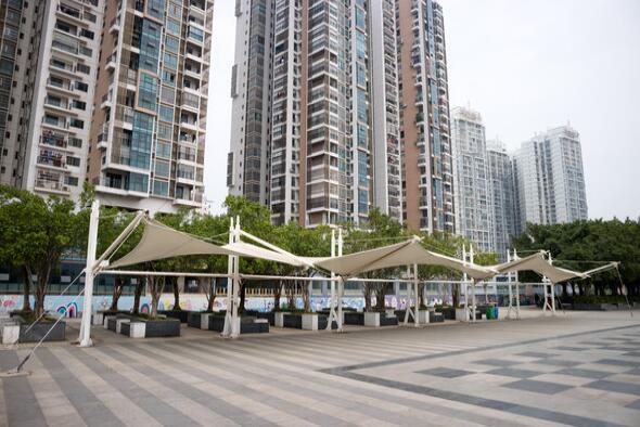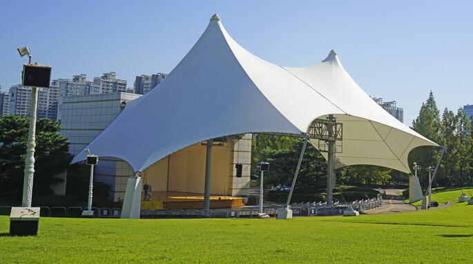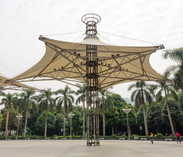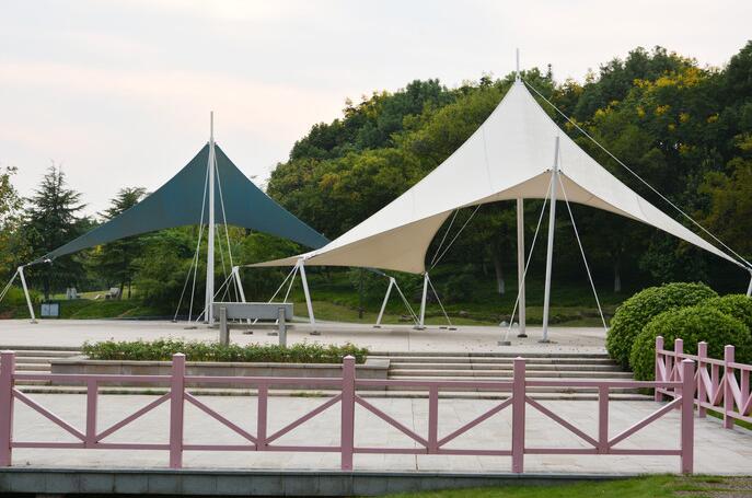 膜結(jié)構(gòu)主要由膜材、鋼索及支柱組成,通過鋼索的抻拉作用使膜材形成張力,以達到固定的結(jié)構(gòu)形式。它以各種自由、輕巧、柔美,充滿力量感的造型,成為園林或景觀裝置的重要組成部分之一。