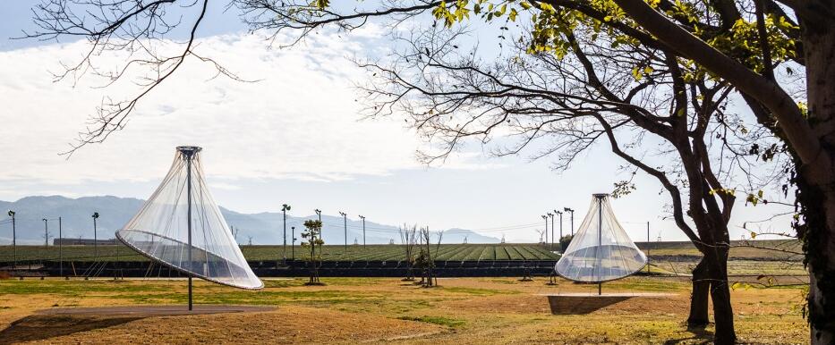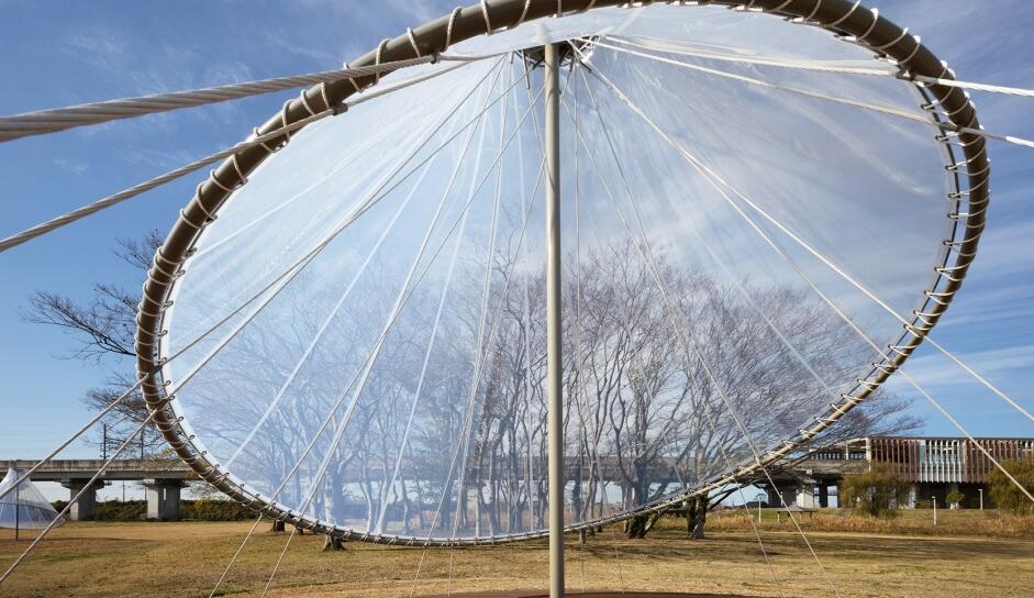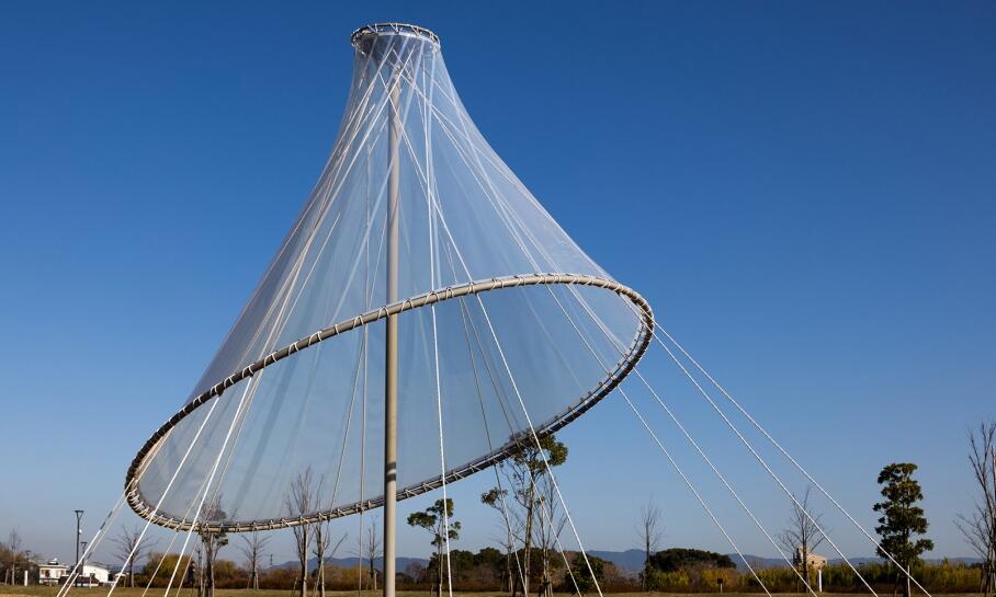 筑后廣域公園位于矢部川旁,是福岡縣面積最大的公園。隈研吾事務(wù)所在這座公園內(nèi)設(shè)計(jì)了一組輕盈透明的膜結(jié)構(gòu)裝置。