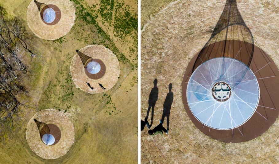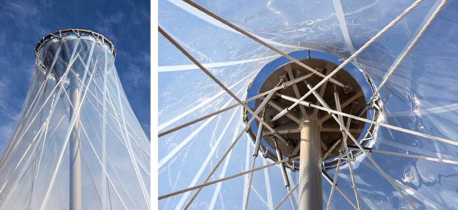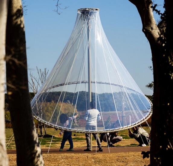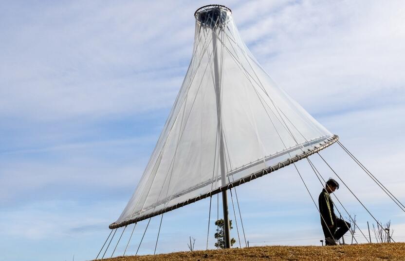 一根偏離于圓心的豎桿將碳纖維繩索呈輻射狀編織到地面,由此設(shè)計(jì)出倒置的漏斗形狀。碳纖維繩上方覆蓋著ETFE(四氟乙烯)材質(zhì)的透明且柔軟的“帽子”,這些現(xiàn)代材料創(chuàng)造出了一個(gè)具有原始感的輕型構(gòu)筑物。