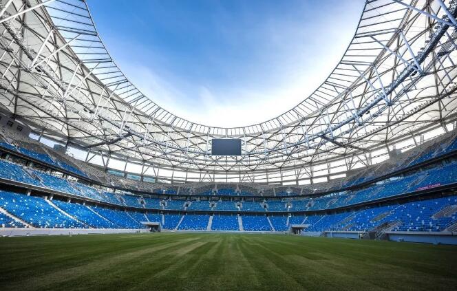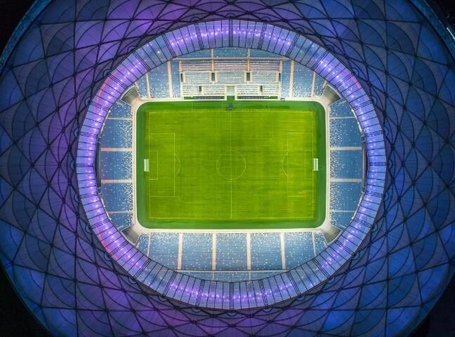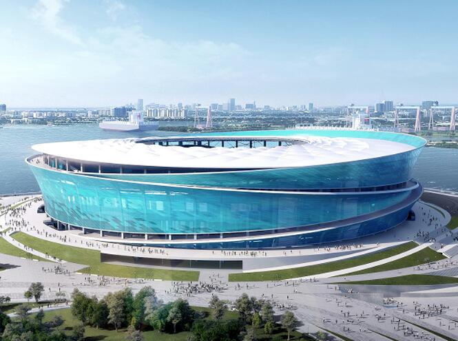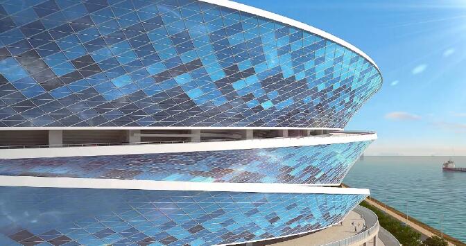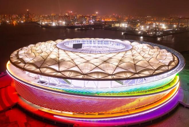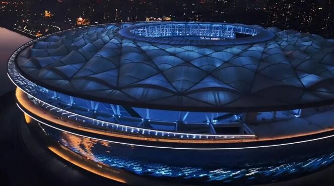 項(xiàng)目屋面由約4萬(wàn)平方米PTFE膜打造成波浪造型,外立面由ETFE索膜結(jié)構(gòu),與環(huán)繞索膜泛光照明體系組成。其中,外立面使用的ETFE膜包含9種藍(lán)色膜材、7823片膜片,是目前世界上專(zhuān)業(yè)足球場(chǎng)膜結(jié)構(gòu)覆蓋面積最大,采用單層ETFE膜結(jié)構(gòu)最多的工程。