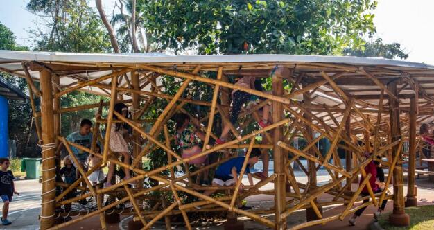 這個項目位于城市中心,并被實際建造出來,其目標是向世界展示竹子作為一種碳足跡極低的生態(tài)材料在建筑業(yè)中的可能性。利用現(xiàn)代的竹子處理技術(shù)來建造大型的持久結(jié)構(gòu),此外,外圍護采用目前流行的新材料膜材來實現(xiàn),更凸顯其環(huán)保安全性能。