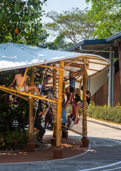 沒有任何游戲設(shè)施的游樂場最初坐落在一塊光禿禿的大型混凝土地板上。該項目圍繞場地上現(xiàn)有的兩棵樹編織成一個無限符號∞的結(jié)構(gòu)。在這個結(jié)構(gòu)下設(shè)有一系列游戲:先是竹竿攀爬、魚網(wǎng)攀爬、過云梯、坐秋千,最后是緬甸式跳格子,依次重復(fù)進行。這些游戲結(jié)合起來創(chuàng)造了一個無限長的障礙賽跑道。