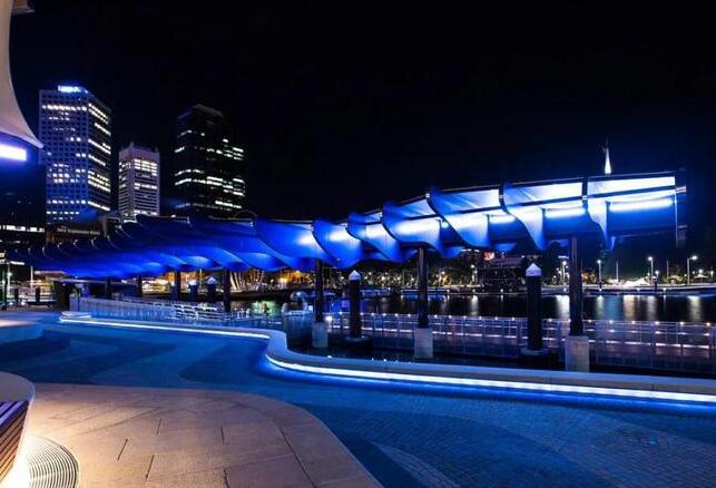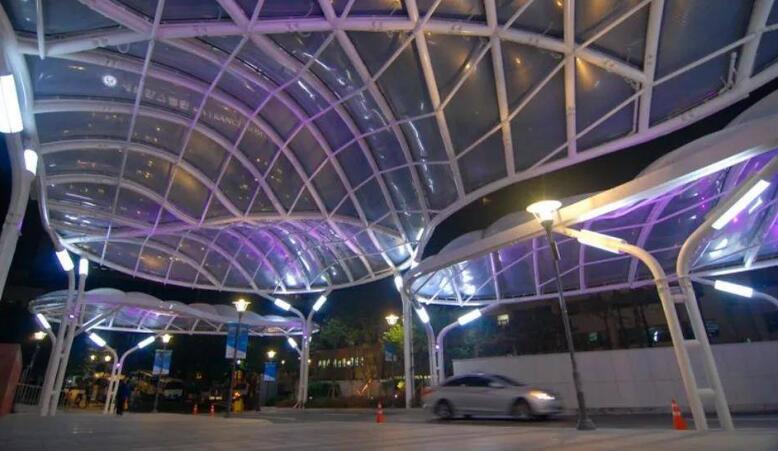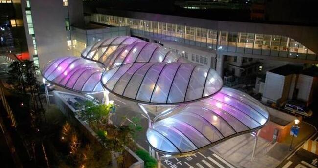 建筑入口材質(zhì)若采用ETFE膜材料,將不再局限于規(guī)則的形態(tài),可以營(yíng)造出豐富的外觀形態(tài)效果,從而凸顯現(xiàn)代特色。另外,由于ETFE膜具有良好的透光性,夜晚借助照明系統(tǒng)和數(shù)控技術(shù),能使整個(gè)出入口如燈籠般通體透亮,藝術(shù)效果出眾,具有一定的時(shí)尚感,能很直觀的增加公眾的吸引力。