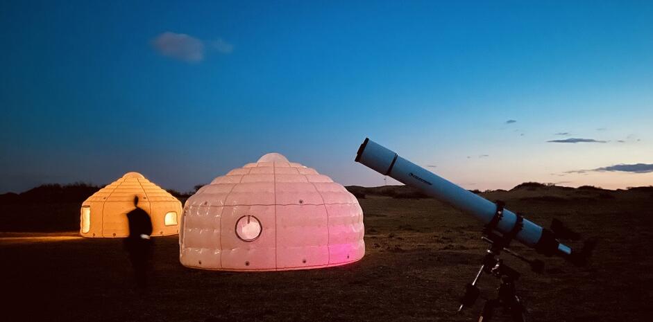 充氣蒙古包的設(shè)計(jì)上選用了典型蒙古包和仙人柱的形制。哈納部分增加了不同大小的窗戶,陶腦部分改為透明星空天窗。通過點(diǎn)式和線式兩種熱合工藝,形成了充氣蒙古包外觀造型。