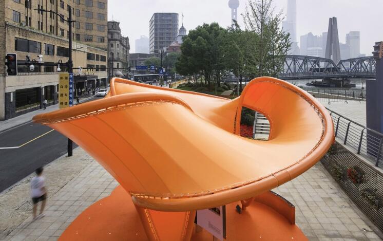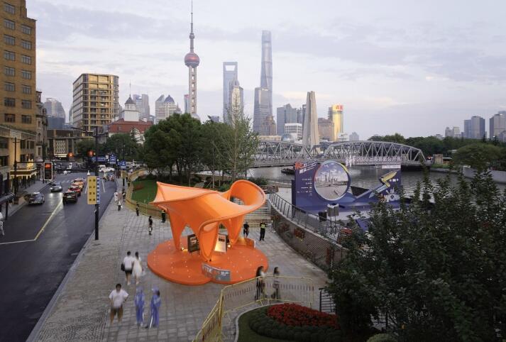 展亭坐落于上海北外灘濱江,名海泰展亭,是零幾建筑為2023年上海賽艇公開賽設(shè)計的品牌展亭。在賽艇比賽中,船槳沖擊水面形成漩渦,而后逐漸消散,繼而變化出新的漩渦,這是展亭設(shè)計的靈感來源。建筑師用計算機算法生成了三個莫比烏斯環(huán),以構(gòu)成展亭的形態(tài)。每個莫比烏斯帶代表運動員追求卓越的個體力量,三個莫比烏斯帶互為起承,合為一體,抽象的漩渦誕生了濱江岸一處人工景觀。