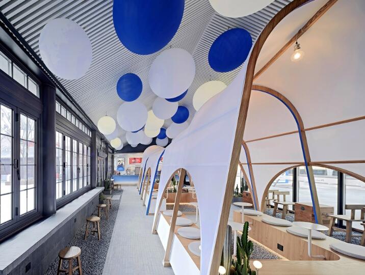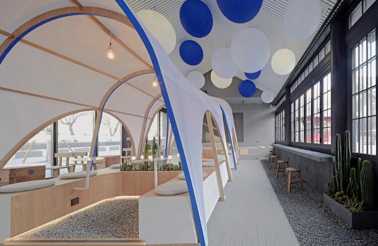 咖啡館位于蒙藏學(xué)校舊址入口南面,是西單北大街上蒙藏學(xué)校舊址傳統(tǒng)建筑群的一部分??Х瑞^來源于帳篷的靈感,希望能在室內(nèi)營(yíng)造戶外公園般的輕松氛圍,在一個(gè)單一的狹長(zhǎng)空間里,用一種輕盈的方式重新定義空間。