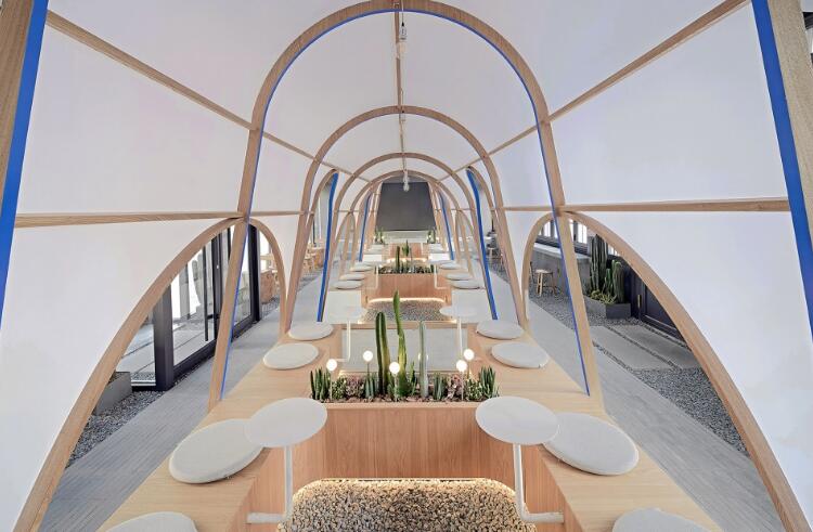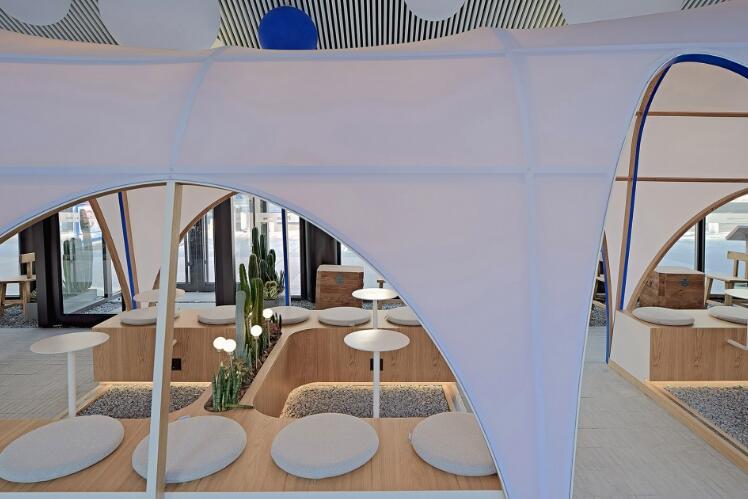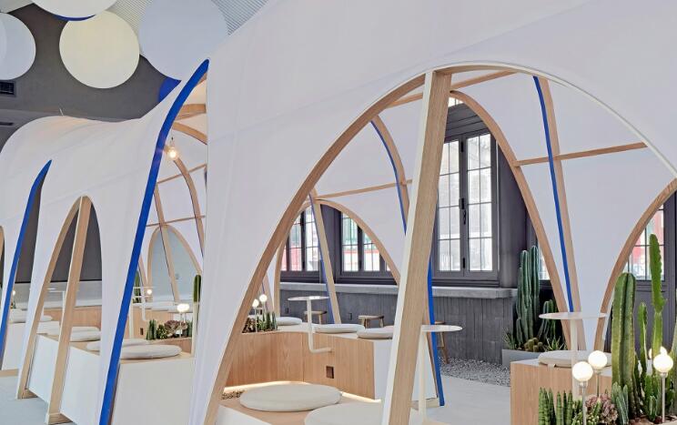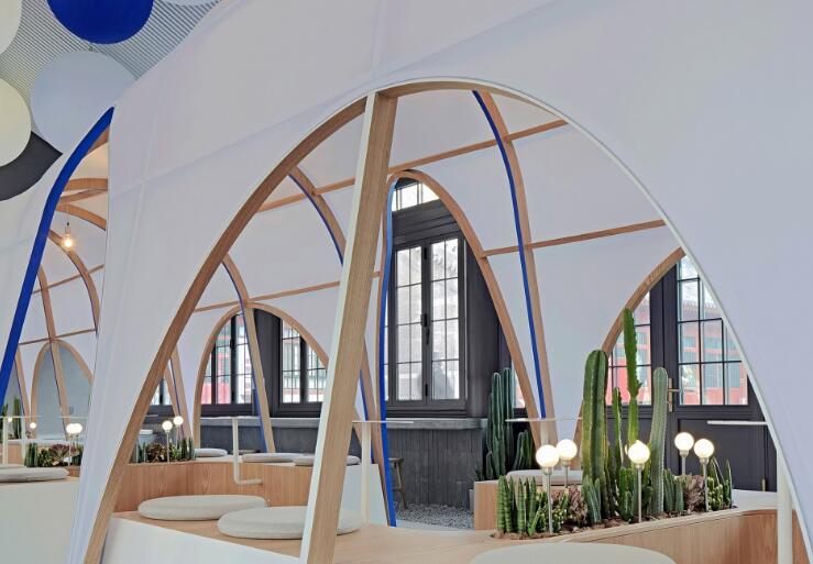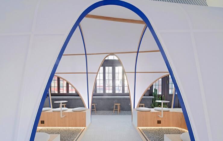 帳篷的最大特色在于其通透的弧線邊界,在視覺上具有獨(dú)特的視覺魅力,身處其中有一種置身戶外的松弛感。