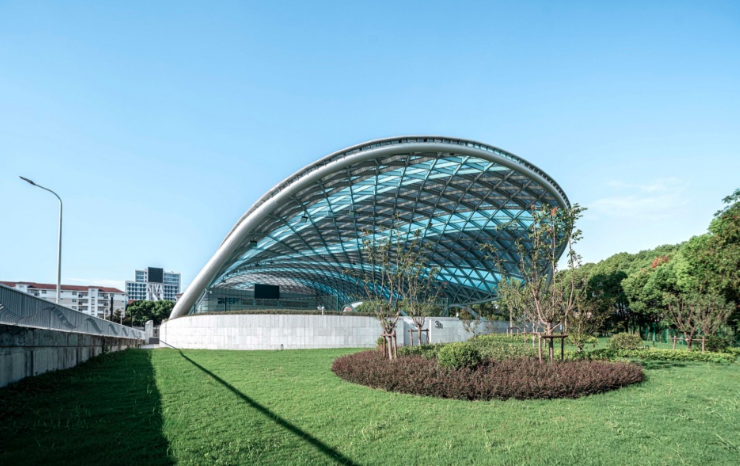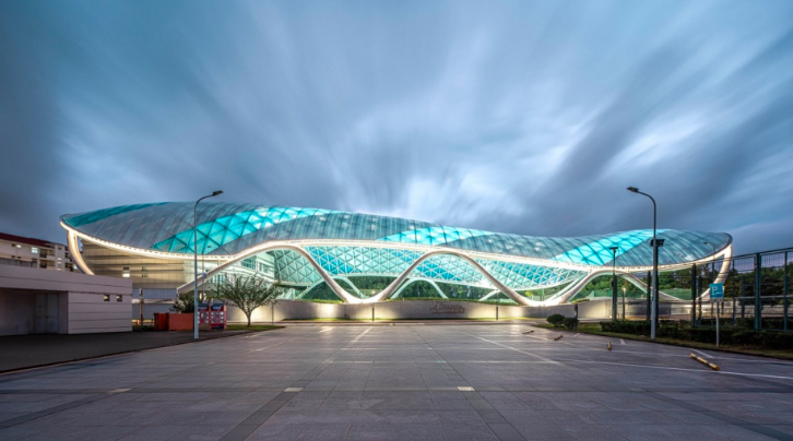 弧形屋面由單層 ETFE張拉膜包裹金屬骨架形成,骨架由簡潔的三角元素拼合而成。從內(nèi)部看,富有節(jié)奏和律動的變化,產(chǎn)生了韻律之美。在膜材的選擇過程中,特意選取藍(lán)、白兩種顏色以及不同透明度的膜材,按照金屬鋼骨架的結(jié)構(gòu)走向進(jìn)行間隔搭配布置,呈現(xiàn)出跳躍般的變化。弧形的表面反射出周圍環(huán)境,模糊了屋頂與天空的界線。建筑兩個長邊采用了波浪狀的飄帶鋼柱展現(xiàn)出柔中有剛的力量感,實現(xiàn)了結(jié)構(gòu)成就建筑之美的理念。