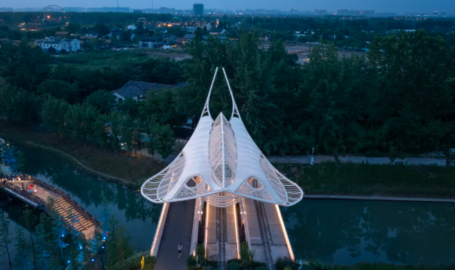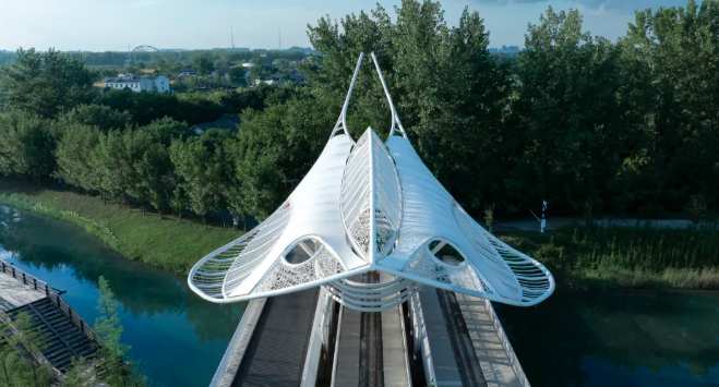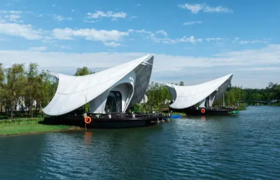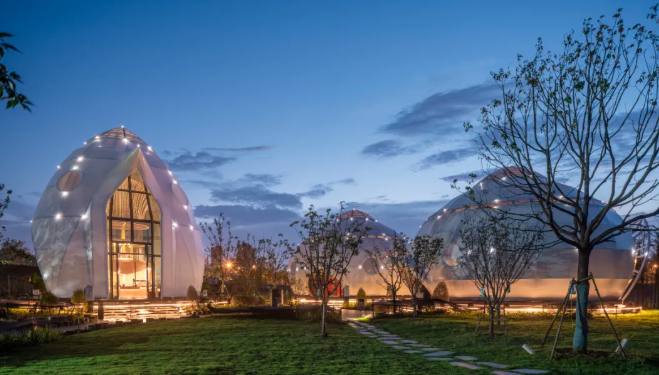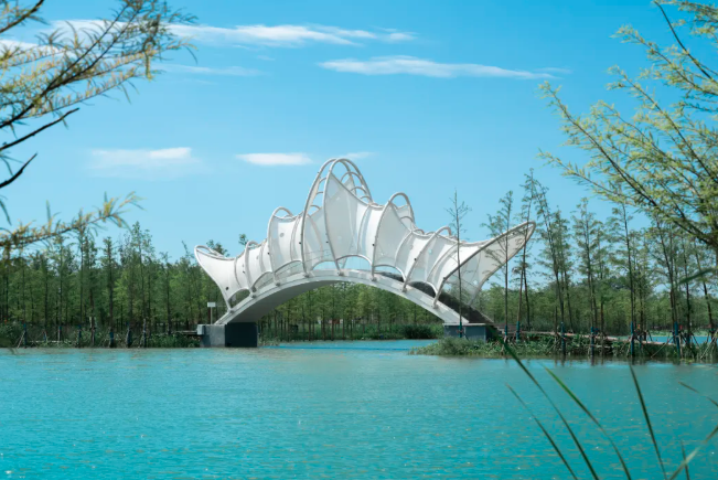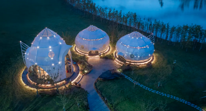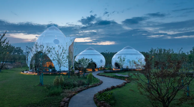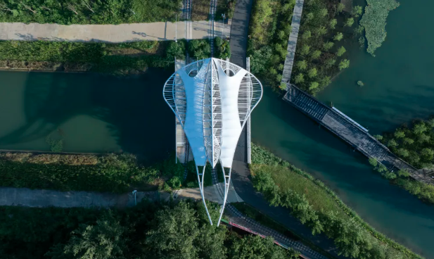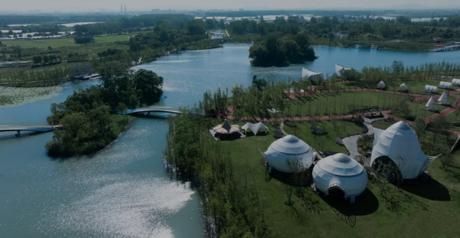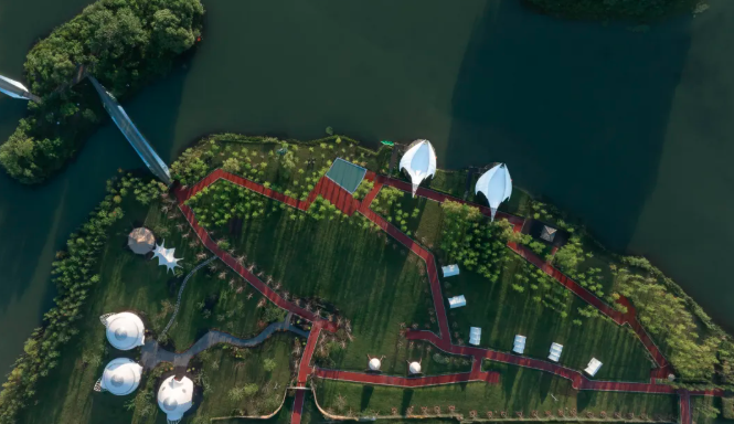 圩美磨灘位于合肥大圩農(nóng)業(yè)區(qū),這里有一處獨(dú)特的露營服務(wù)區(qū),建筑與自然景觀完美融合,營造出充滿童趣的空間場景。設(shè)計師巧妙運(yùn)用鳥、蟲、螺等自然動物仿生的設(shè)計語言,通過現(xiàn)代建筑空間和技術(shù)將建筑隱匿于綠林之中,展現(xiàn)出別具一格的美感。