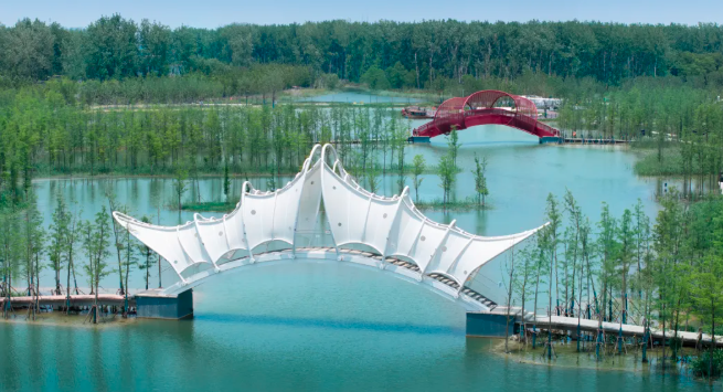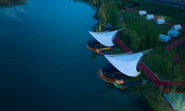 在圩美磨灘萌鳥營地中設(shè)計師善于運(yùn)用輕盈膜結(jié)構(gòu)來詮釋“童心”,客房、辦公區(qū)、橋等場所都能看到膜結(jié)構(gòu)元素,透光通風(fēng)的膜結(jié)構(gòu)材質(zhì)捕捉著大自然的光線與微風(fēng),營造出溫馨而自然的氛圍。