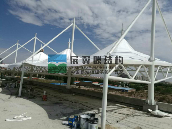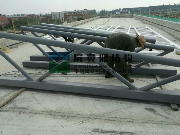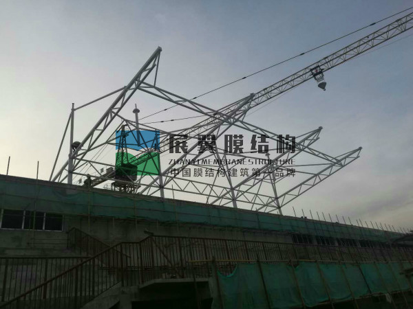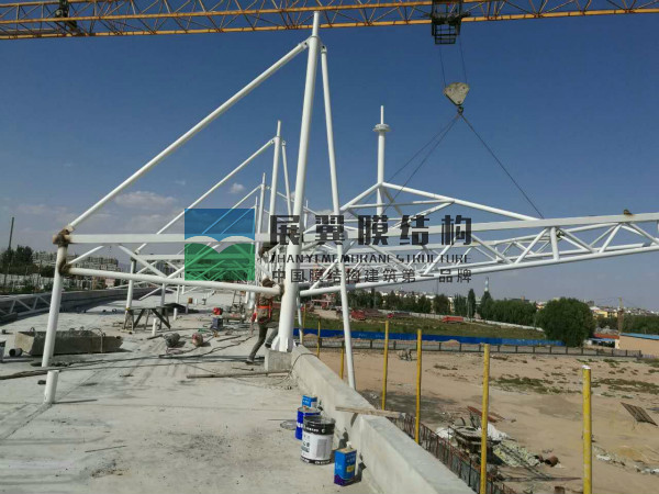 寧夏中寧第六中學(xué)膜結(jié)構(gòu)主席臺工程近日正在施工,工程現(xiàn)已完成材料加工、油漆、焊接、吊裝、膜材覆蓋等工作,接下來進(jìn)行結(jié)構(gòu)附件緊固及膜材拉伸除皺工作,以下為現(xiàn)場施工圖片: