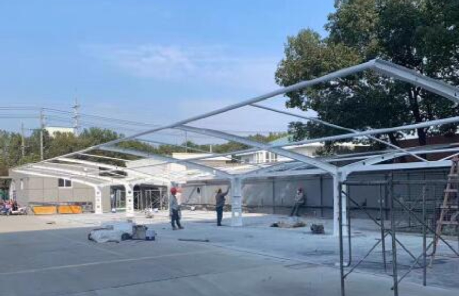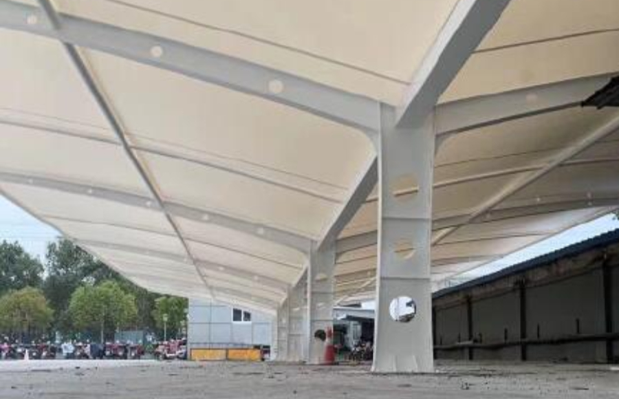 江蘇連云港贛榆區(qū)工廠張拉膜結構停車棚近日完工,車棚為雙邊挑篷造型,實用美觀,采用PTFE建筑膜材。