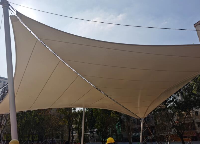 深圳寶安區(qū)廣場(chǎng)景觀膜結(jié)構(gòu)遮陽(yáng)棚工程完工,該遮陽(yáng)棚設(shè)計(jì)為經(jīng)典飛燕造型,整片張拉,簡(jiǎn)潔大方,美觀兼實(shí)用,是居民休憩好去處。