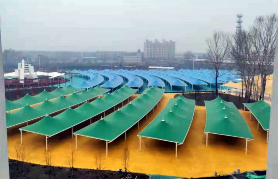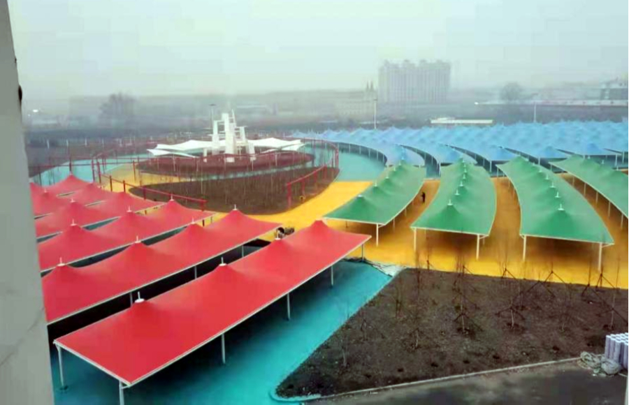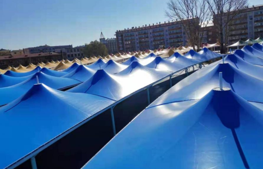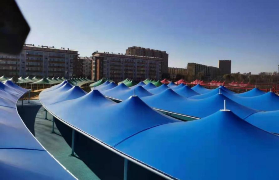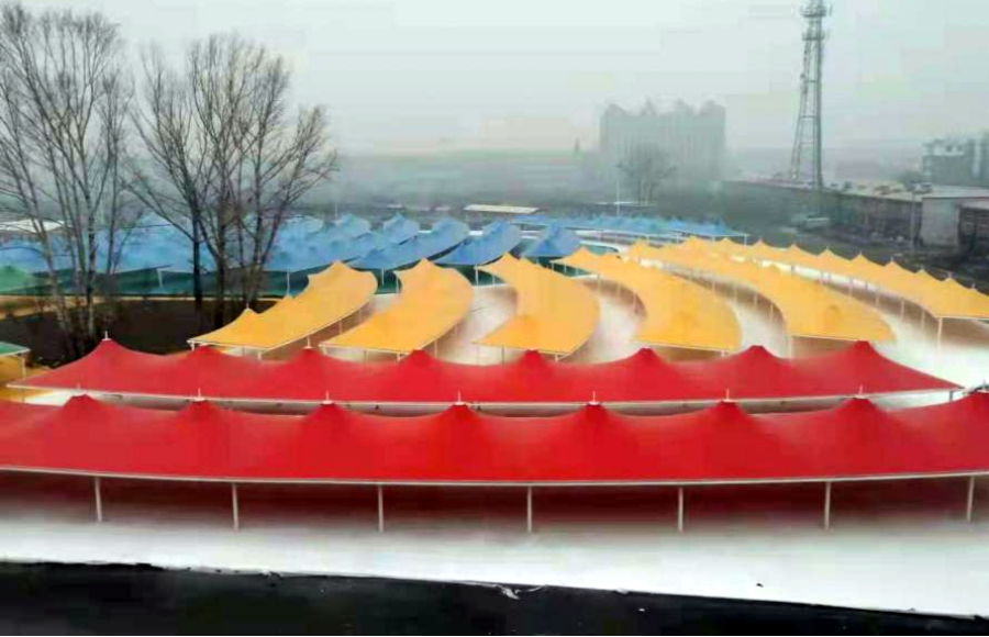黑龍江鐵力經(jīng)開(kāi)區(qū)集市大棚膜結(jié)構(gòu)工程近日完工,大棚設(shè)計(jì)為尖頂張拉結(jié)構(gòu),采用白、紅、黃、藍(lán)、綠五色膜材,一排排一列列遍布于廣場(chǎng)之上,顯得十分壯觀。