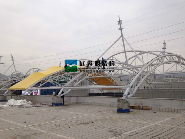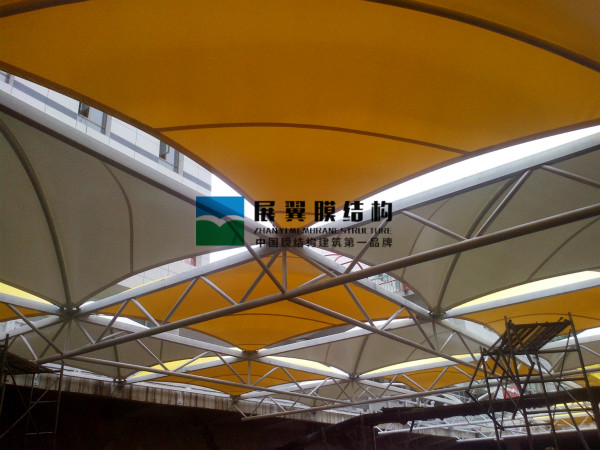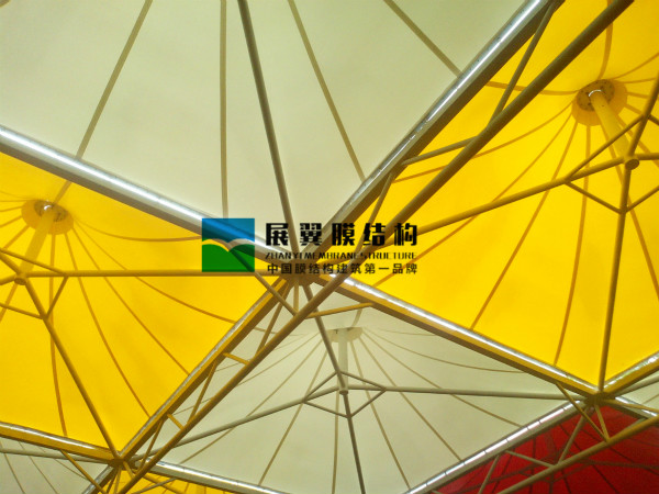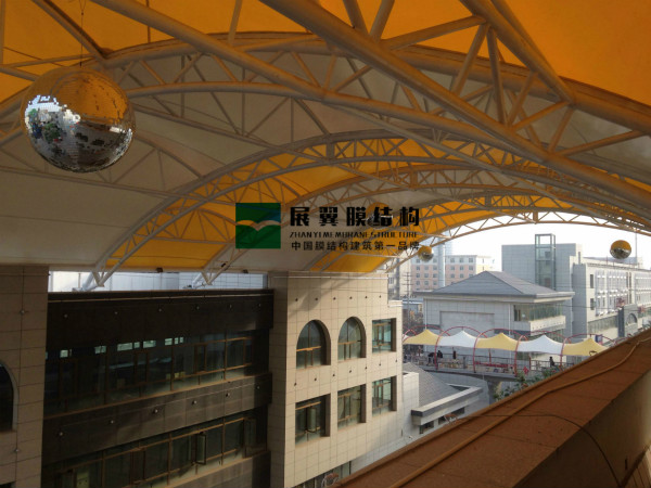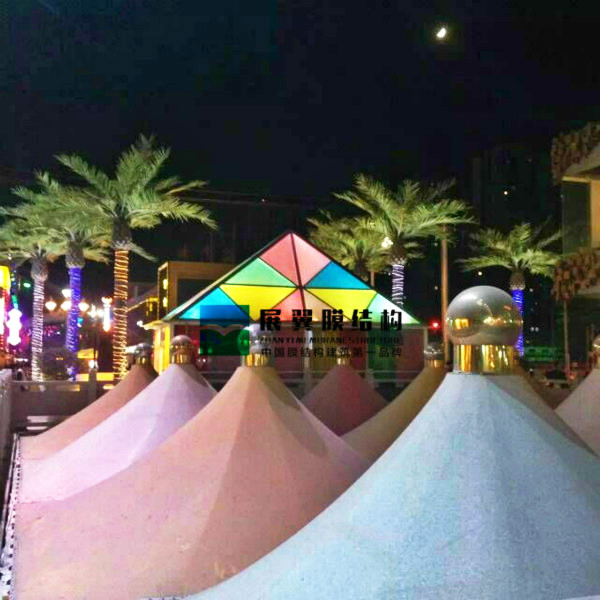 蘭州金牛街膜結(jié)構(gòu)工程全系列包括膜結(jié)構(gòu)天井、膜結(jié)構(gòu)屋頂遮陽棚、膜結(jié)構(gòu)天橋通道遮陽棚、啤酒屋膜結(jié)構(gòu)屋頂、特殊膜材玻璃房等等、工程全部采用彩色膜材搭配建造,造型設(shè)計別出心裁。這些張拉膜建筑不但具備強大的實用功能,同時也成為了商業(yè)街一大觀賞亮點。