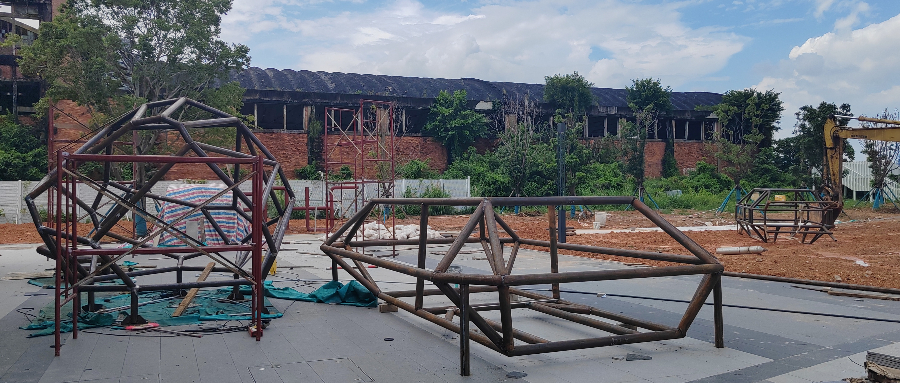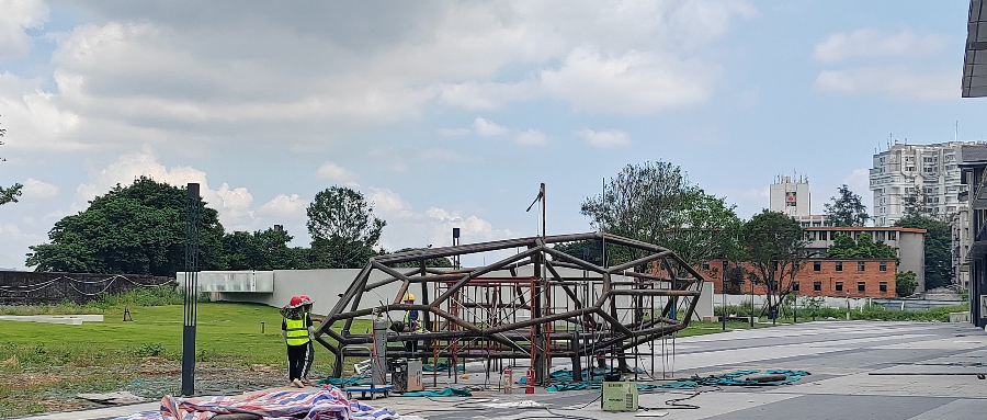 粵海江門甘化廠濱江綠化帶景觀膜結(jié)構(gòu)工程正在施工當(dāng)中,目前進(jìn)行鋼結(jié)構(gòu)的拼裝工序。