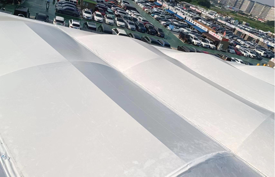 成都市雙流區(qū)二手車市場張拉膜結(jié)構(gòu)大棚工程正在施工,現(xiàn)場看到錯落有致的鋼構(gòu)上方膜材已覆蓋張拉成形,高低起伏的拱形屋頂顯得美觀又時尚,底下空間敞亮,整個結(jié)構(gòu)穩(wěn)固而結(jié)實。