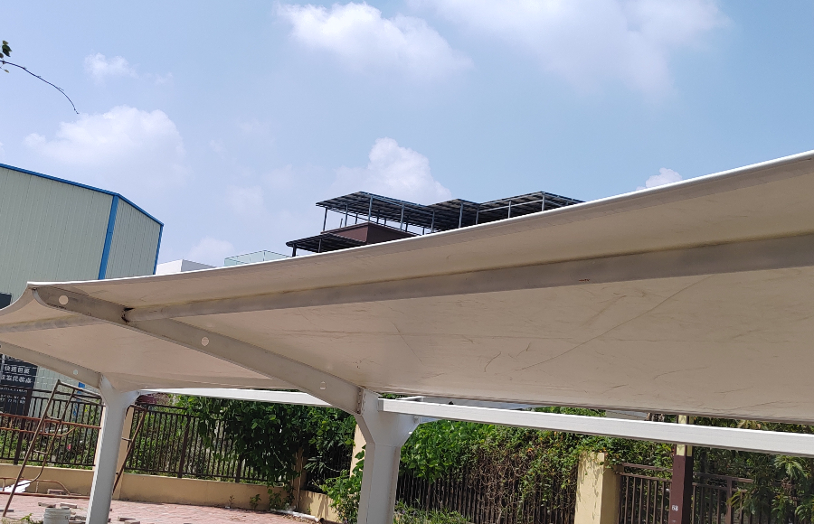 中山美荔新天地膜結(jié)構(gòu)停車棚工程正在施工,車棚設(shè)計為雙邊懸挑造型,目前工程進行膜材的覆蓋工作,不日將完工。