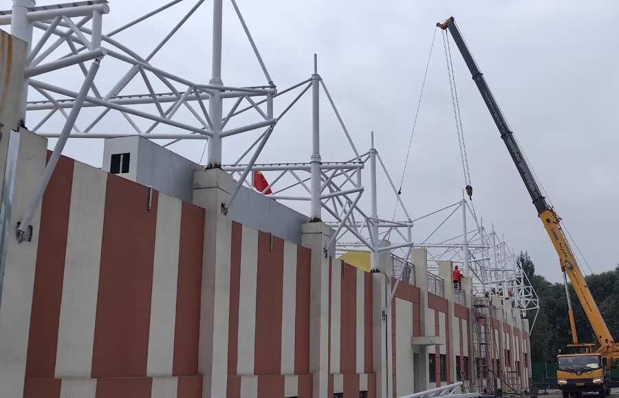 青海海東三中張拉膜結(jié)構(gòu)工程正在施工,工程體量包含風(fēng)雨操場看臺及主席臺罩棚,目前已完成鋼結(jié)構(gòu)吊裝工作,接下來進行膜材的覆蓋。