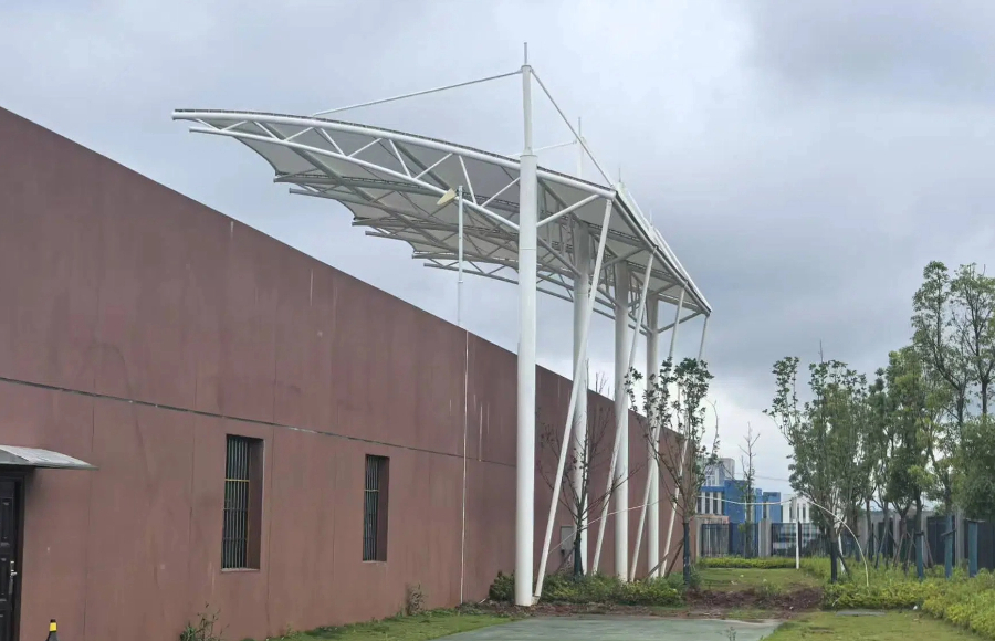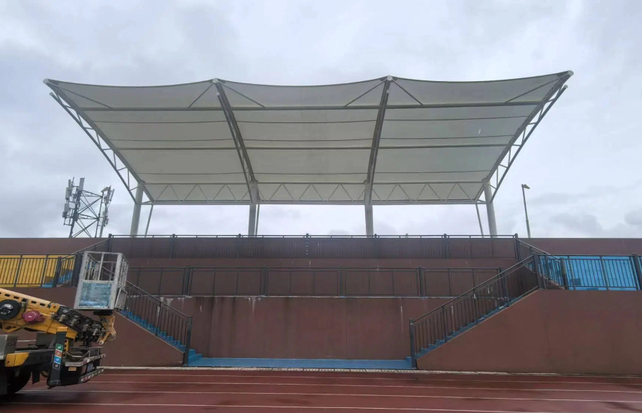 長沙翰林府明德智谷學校膜結構看臺工程近日基本完工,看臺設計為懸挑張拉結構。