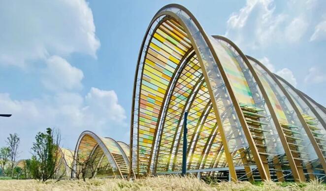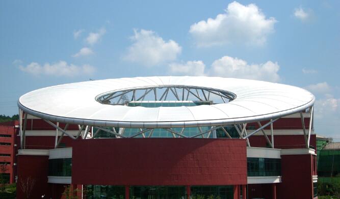 ETFE 膜材的優(yōu)點:透光率高(透明膜材可達90%)、透光透景,色彩豐富(可以各種顏色,而且通過鍍點可以控制透光率和遮陽系數(shù)),柔韌性好,非常適合應用于(氣枕式)充氣膜結(jié)構(gòu)形式,以及膜單元板塊面積較小的單層張拉膜。