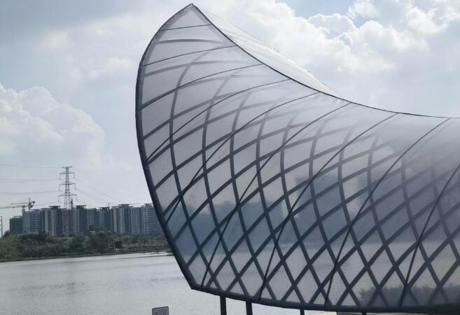 STFE 膜材的優(yōu)點:覆膜的清晰度較好,可實現(xiàn)一定程度的透景。同時,由于有織物基材提高了膜材強度,抗拉強度可達4000N/5cm。即使不加拉索,膜單元跨度一般在3m以上。