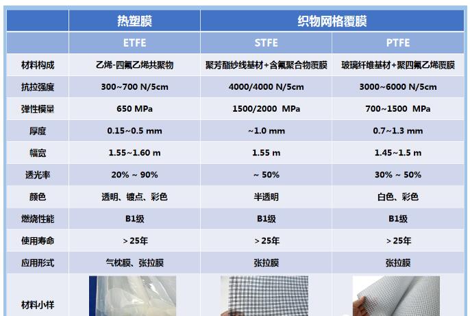 下表將三種膜材的常規(guī)性能參數(shù)匯總,便于選用。