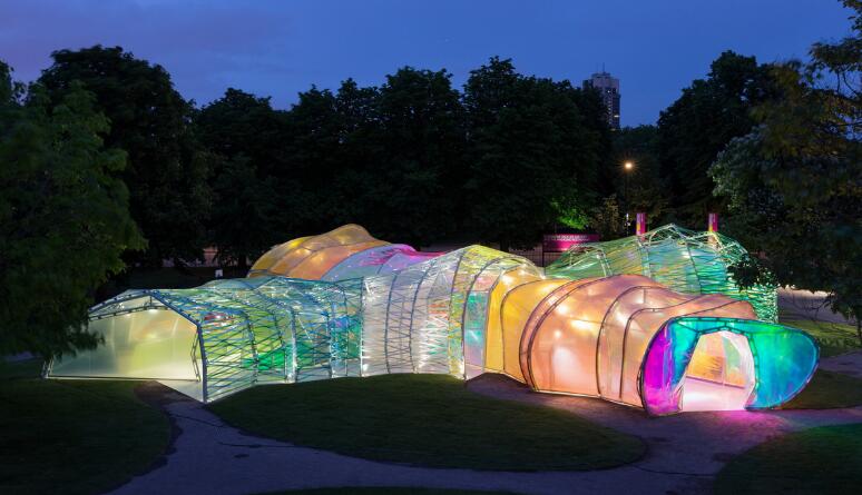 在非體育建筑上,ETFE也被廣泛應(yīng)用,最受關(guān)注的當(dāng)屬SelgasCano設(shè)計(jì)的2015蛇形畫(huà)廊,建筑師用了19種不同顏色的薄膜包裹了一個(gè)極簡(jiǎn)的鐵質(zhì)框架,來(lái)呈現(xiàn)一種萬(wàn)花筒的效果。另一個(gè)例子是KieranTimberlakeArchitects設(shè)計(jì)的倫敦美國(guó)大使館,ETFE的鰭狀凸起有助于建筑東西南三面的遮陽(yáng),同時(shí)增加進(jìn)光量并防止鳥(niǎo)類誤撞。