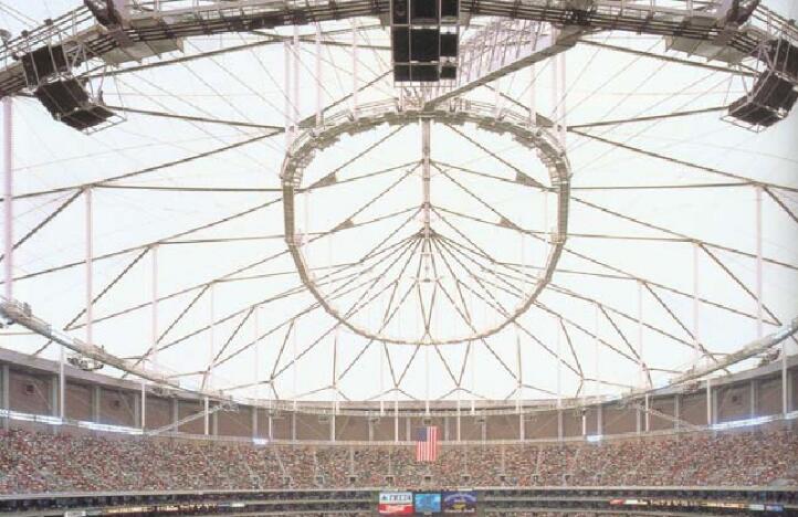 佐治亞穹頂展示了索膜穹頂?shù)臉?gòu)成,周邊為橢圓形的受壓剛性環(huán)梁,嵌固于環(huán)梁上的是環(huán)向遞近的索網(wǎng)(上、下拉索與下環(huán)索)和豎向壓桿(飛桿)組成的三角形空間網(wǎng)格張力體系,膜面嵌固在穹頂上部的棱形索網(wǎng)格上,索膜穹頂經(jīng)施加預(yù)應(yīng)力后成型,成型后的棱形膜面沿長(zhǎng)向的坡度應(yīng)能順暢地排水。