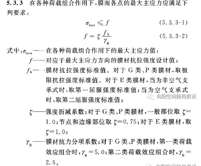 另外,美國規(guī)程不僅分別驗算了膜材經(jīng)向和緯向強度,還驗算了經(jīng)緯向的組合強度。但膜面的經(jīng)緯向應力一般不會同時最大,所以通常不是控制情況。