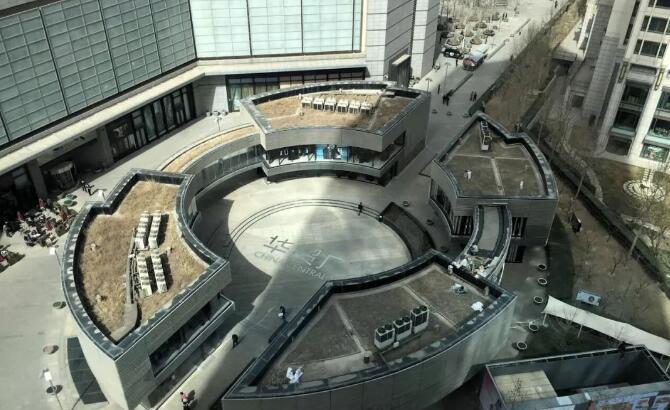 北京華貿(mào)中心是由寫字樓、商城、酒店公寓等組成的大規(guī)模商務建筑群,其間為華貿(mào)廣場,后由于使用功能要求在廣場上加建頂蓋,如圖1所示。由于周邊結構已經(jīng)建成,故甲方希望加建的頂蓋,自重要輕、支座反力要小、施工要快、造型要新穎。因此經(jīng)過多方案比較,最終選定了索穹頂結構形式。