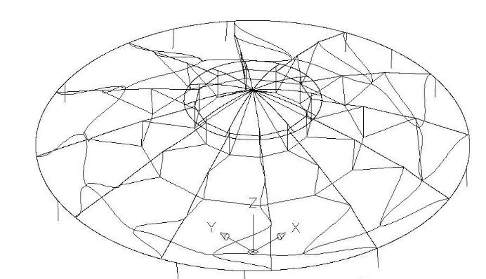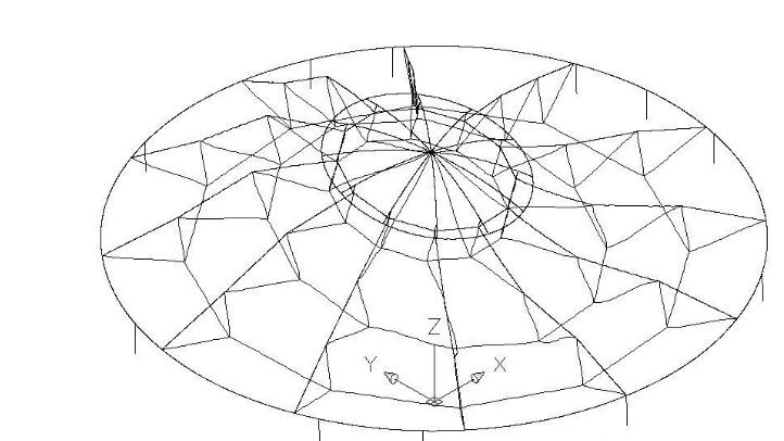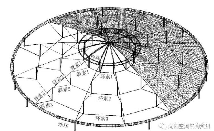 定義一下結構各構件的名稱,分別為內(nèi)環(huán)、外環(huán)、脊索1~3、環(huán)索1~3、斜索1~3、撐桿1~3,如圖2所示。邊界條件是確定的,即外環(huán)直徑33.4米、內(nèi)環(huán)直徑9米。而穹頂?shù)氖父摺⒚扛鞯念A拉力是未知的。初始形態(tài)設計就是要尋求滿足邊界條件、在合理的預拉力分布下,結構的外形包括矢高。所謂合理的預拉力,就是預拉力不能太小也不能太大。太小,剛度不足,在荷載作用下結構變形不能滿足規(guī)范要求;太大,桿件強度又不能滿足規(guī)范要求,無休止的加大截面又會造成用鋼量增加。因此,這是一個假定預拉力分布、找形、受荷計算、調(diào)整預拉力分布、再找形、再受荷計算,直至循環(huán)到合理的預拉力分布及其對應的形狀的過程。