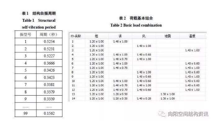 然后對結構進行各種荷載及作用組合下的計算分析,基本組合如表2所示。經(jīng)過對結構的非線性分析,結構中心點在恒荷載與活荷載標準值作用下?lián)隙葹?06mm,跨度為33.4m,106/33400=1/315,滿足規(guī)范中不大于1/250容許撓度值的要求[4]。