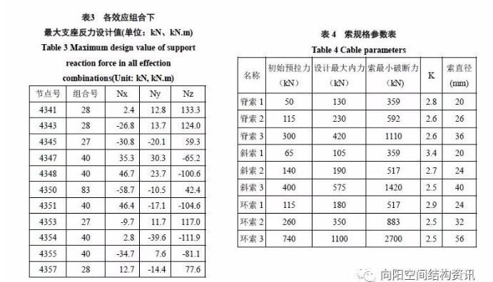 由于索穹頂在內(nèi)外環(huán)之間為自平衡體系,所以對下部混凝土支撐結構的反力比較小,支座反力如表3所示。需要說明的是,受下部混凝土結構的柱頂位置限值,支座并非等距均勻布置。另外,各支座的最大反力也不是在同一組合下產(chǎn)生的。但仍舊可以看出,各個鉸支座反力絕對值都不大,提供了加建頂蓋的可行性。