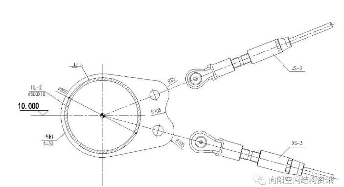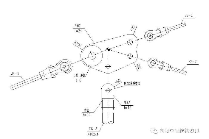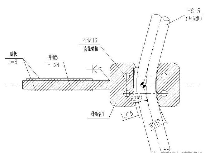 索穹頂?shù)墓?jié)點設計,既要保證符合計算假定,又要便于施工張拉,因此正確合理的節(jié)點設計是關鍵的一步。以下例舉幾處索穹頂膜結構的特有節(jié)點。如圖8所示,為脊索、斜索匯交與外環(huán)梁處的節(jié)點。圖9所示為撐桿下端與脊索的節(jié)點。圖10所示為撐桿上端與斜索及環(huán)索的節(jié)點。圖11為實際索節(jié)點照片。