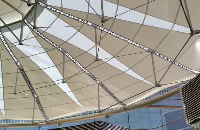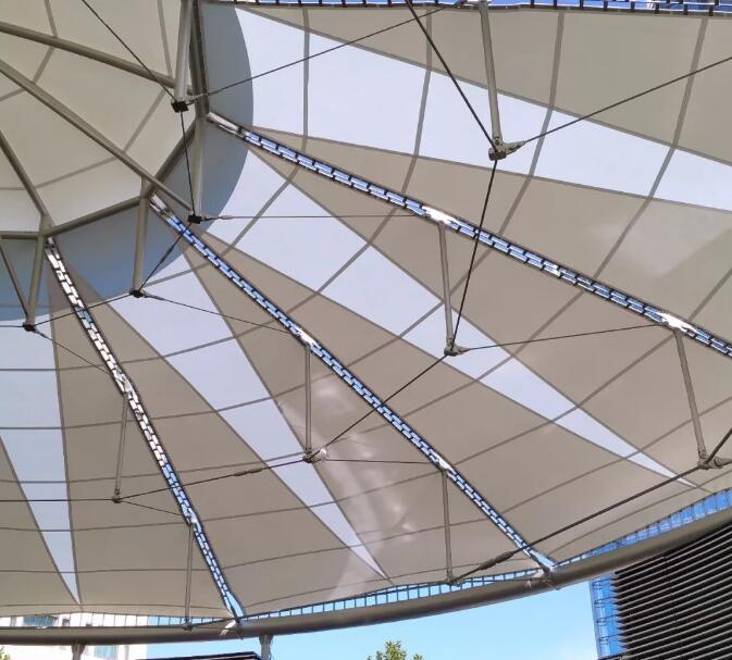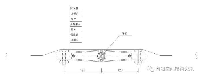 膜面與脊索的連接節(jié)點如圖12所示。另外我們知道,膜結構還需要進行裁剪設計,即用平面的、有一定幅寬的膜材,通過裁剪,拼接出曲面的膜單元。一般來講,拼接縫的布置首要考慮的是膜材的利用率,盡量的減少裁剪損耗。本項目在兼顧利用率的同時,更注重的是美觀。根據(jù)索的布置特點,如圖13所示將拼接縫設計為輻射狀的環(huán)形,實際效果圖14所示。
