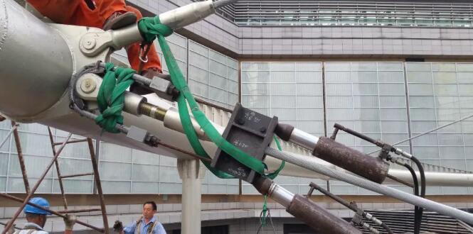 五、張拉斜索3,這是最重要一步。當然,如果12根斜索3同時張拉是最理想的,但由于設備限制,采用分組分批張拉的辦法,即對稱的4根斜索同時張拉,達到設計預定值的70%;然后進行下一組的4根斜索的張拉,至設計預定值的80%;接著進行最后一組4根斜索的張拉至預定值的90%。然后進行第二次循環(huán),直至100%達到每根斜索3的設計預拉力值。